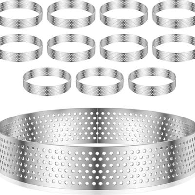 7. Once chilled, remove it from the freezer and working quickly, peel the silicon mat off of the dough. Take 2 of the 4” perforated ring molds (very lightly greased with soft butter) and press these into the dough.