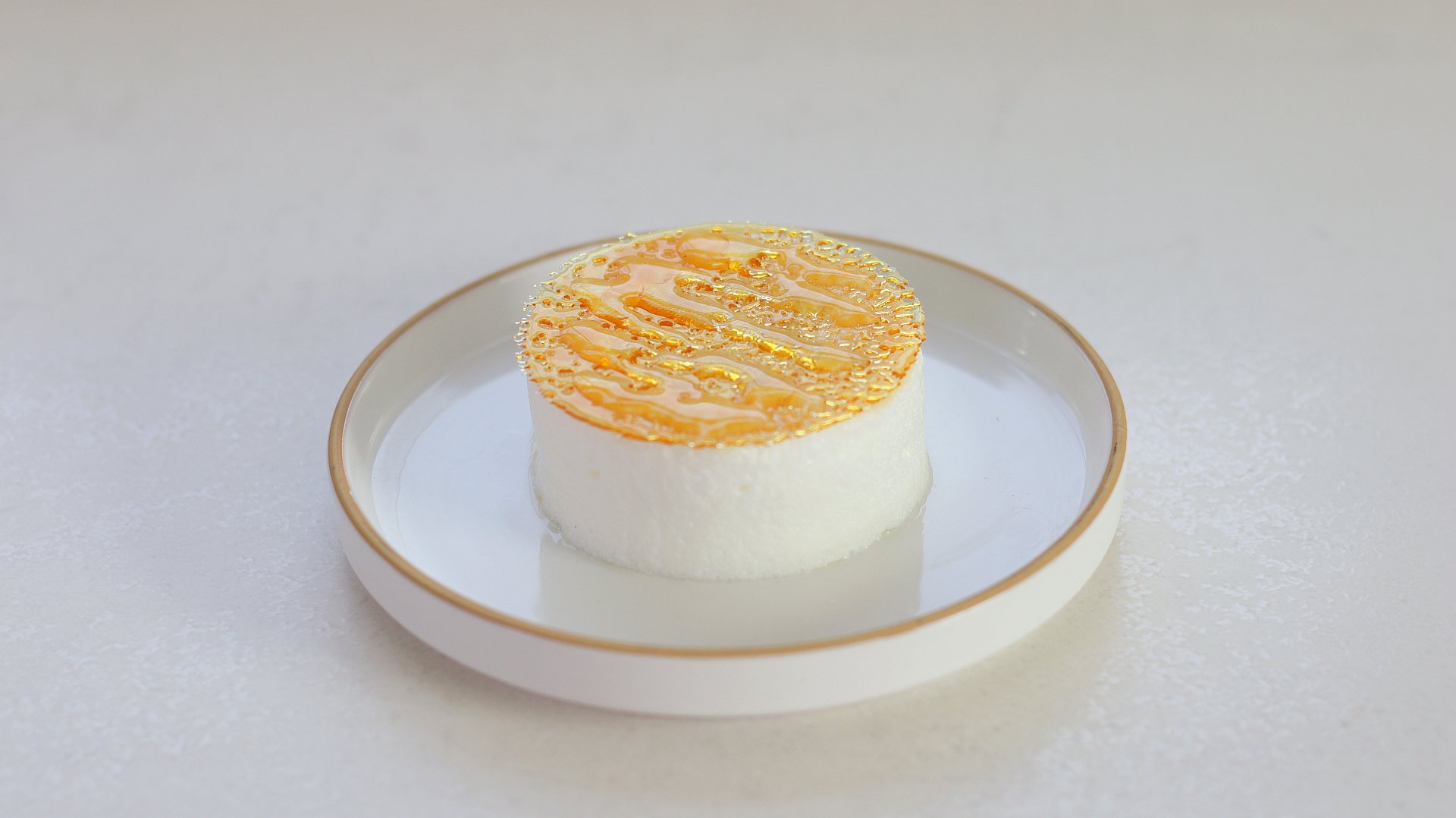 For Tier 1 I decided to try a twist on the classic Île Flottante, inspired by working in the kitchen with Tom Aiken. Typically made by poaching a meringue and serving it in a warm bowl crème anglaise, this version is much more refined, with a Swiss meringue that is cut into a perfect disc. We fill the centre with crème anglaise and then top it with a thin caramel disc and clear caramel sauce.