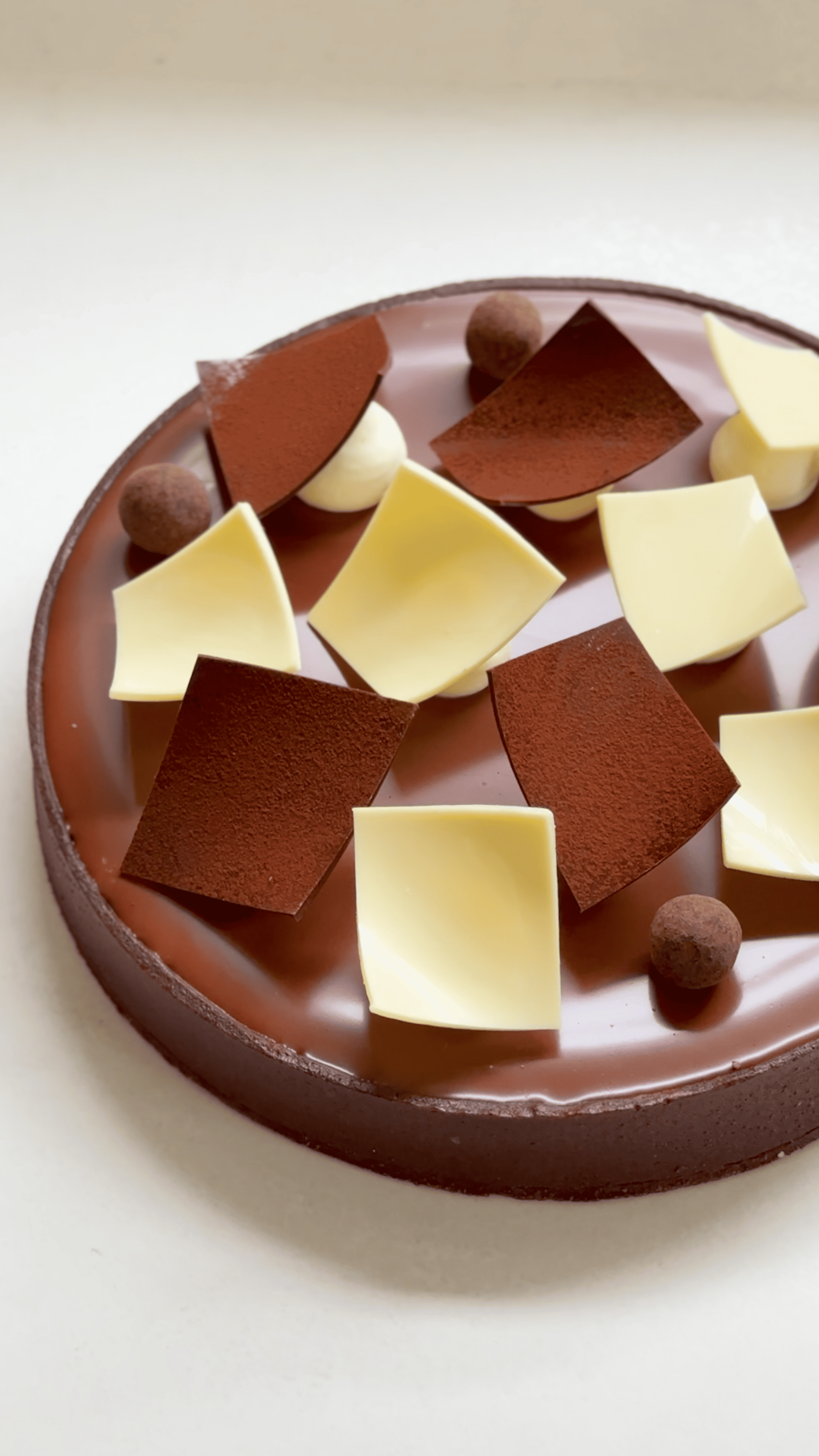 It is all about the chocolate, with a chocolate sweet pastry case, salted caramel filling, baked chocolate custard, and finally a thin layer of ganache for a clean and elegant finish.
