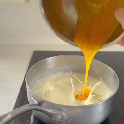 Cook the mixture to 45C/113F on a digital thermometer and then pour in the remaining dry ingredients, along with the egg yolks and continue to whisk.