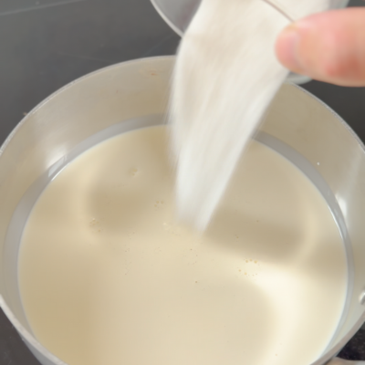 Pour the sugar/xanthan mixture into a medium saucepan, along with the milk and cream. Place this over a medium heat, whisking constantly. Note if you are using a cream with a lower fat percentage, that is absolutely fine, the texture will just be slightly different as the fat content of the gelato will be lower.