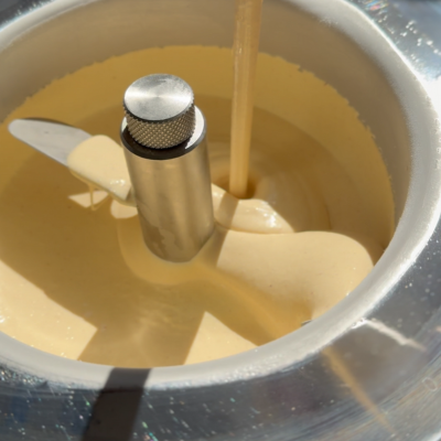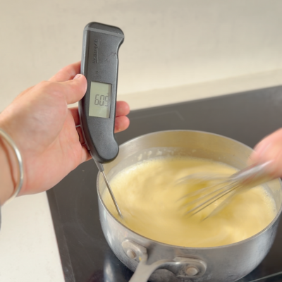 Cook the mixture to 80-83C/185F - it will be quite thick, almost like a custard because of the xanthan gum, Immediately remove it from the heat and pour it into a tall measuring jug and blend with a hand blender for 30 seconds. Note - I said to cook it to 85C in the video but that was a mistake (!)
